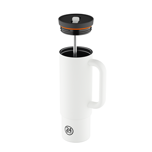 Straw Cup 800 ml. er den termiske, lette termokop i rustfrit stål. Det raffinerede og originale design gør den til den perfekte termokop at tage med på farten, uanset om du skal på kontoret eller i fitnesscenteret. De forskellige farver og det kompakte design tilbyder smukke løsninger til alle slags personligheder, der kombinerer æstetik med praktisk. Straw Cup er en 100% isoleret og vaskbar termokop. Du skal ikke bekymre dig om at miste en eneste dråbe af din yndlingsdrik. Denne termokop er skabt til at holde i lang tid, og det er derfor, den repræsenterer et godt alternativ til en plastflaske. Den er meget nem at bruge og den store åbning gør den super nem at gøre ren. Låget med sugerør gør det nemt at drikke oprejst, uanset om du går eller kører bil. Bunden af Straw Cup er designet til at passe til de fleste bilers kopholdere. Koppen kan holde kold i timevis, tæt og lækagesikker. Tilføj flere funktioner til din flaske med mange forskellige låg og diverse 24Bottles tilbehør. Vægt: 495 g Base diameter: 7,3 cm Mund: 8 cm Højde: 23,5 cm Materiale: 18/8 fødevaregodkendt rustfrit stål Hermetisk forsegling: Silikone 100% sikker: BPA-fri, BPS-fri, PES-fri, PFAS-fri og phthalat-fri Pleje og vedligeholdelse. Det er nemt at rengøre dine 24Bottles-produkter. Vi anbefaler altid vask i hånden ved at skylle dem med varmt vand efter hver brug, især hvis de bruges til at opbevare en anden væske end vand. Vi foreslår også regelmæssig vask: god vedligeholdelse af dine 24Bottles vil sikre, at du kan bruge dit produkt i mange år. Du skal blot bruge varmt vand og neutral sæbe, eller en blanding af varmt vand og eddike eller en teskefuld bagepulver til et mere naturligt alternativ, faktisk, når de bruges separat, er de en fremragende rengøringsløsning og absolut mere naturlig end opvaskemiddel. Når den er vasket, skal du altid lade flasken tørre på hovedet og uden låg.