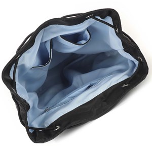 Sørine rygsæk i Novara nylon fra Adax. Rygsæk i vandafvisende nylon med justerbare stropper og bærehank i toppen af tasken. På bagsiden er tasken syet i vatteret mønster med en lille lomme, på fronten af tasken er der en lille lynlåslomme. Rygsækken har klaplukning med snørrelukning under klappen. Indvendig består rygsækken af et stort åbent rum med 2 små åbne lommer i den ene side og en lynlåslomme i den anden side. Selve tasken er i recycled nylon.