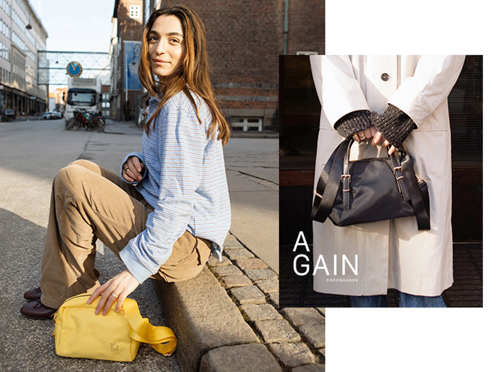 Again arbejder med sæsonens populære farver, fra de brændte toner til en frisk gul sommerfarve. En anden stor trend, som Again taler ind i, er bæltespænde looket. På den måde kan selv neutrale farver eller et clean design brydes op med markante detaljer, der giver taskerne karakter.