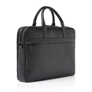 MOSS laptoptaske. Det italienske læder er  garvet i henhold til retningslinjerne fra Leather Working Group. Denne funktionelle laptoptaske har polstrede rum til en tablet og en 17" bærbar computer. Dine bankkort, kreditkort og pas er beskyttet mod skimming i den specielle RFID-lynlåslomme. De robuste håndtag og den aftagelige, justerbare skulderrem fuldender denne taske. ONYX-kollektionens tidløse design er kendetegnet ved kombinationen af ​​elegant kornet læder med et vandret, glat bånd, diskret præget med C&B-logoet.