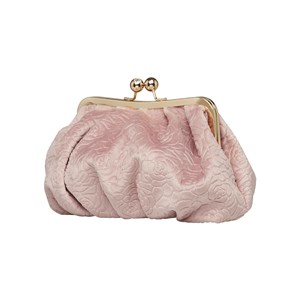 Emma clutch med bøjlelukning og krystaller i 'kisslock' kuglelukningen er lavet i en skøn tyk velour med kameliaprægning. Der er nostalgi og vintage for alle pengene med denne lille taske/toilettaske som passer helt perfekt til både bryllup, fest, højtid og som gave til en du holder af. Den har lysegråt guldprikket fór og to indvendige lommer med lynlås.