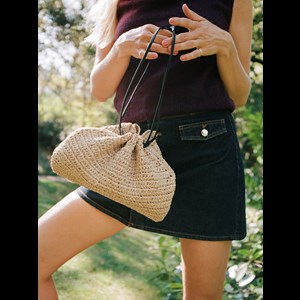 En håndtaske i hæklet papirstrå med scrunch-lukning. Den har et lyst hørfor, en crossbody-strop og kan bæres både i hånden og over skulderen. En let taske, der kombinerer sommerligt udtryk med praktisk funktionalitet.