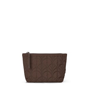 Denne kosmetikpung er designet i et quiltet mønster, og dens ydre stof og inderfor er lavet af genanvendt materiale. Den lukkes med en lynlås.