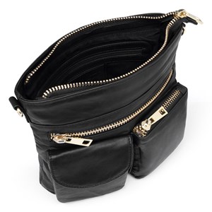 Crossbody taske i en dejlig, blød og lækker skindkvalitet. Tasken har et sejt og råt look, da den er dekoreret med chunky lynlås lomme samt to åbne lommer. Den lukkes i toppen med lynlås. Indvendigt: Crossbody tasken har et primært rum med plads til både mobiletelefon, pung mm. Derudover har den en lille lynlåslomme til småting. Lang aftagelig og justerbar crossbody skindrem medfølger. 100% lammeskind.