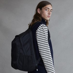 Rygsæk med brede skulderstroppe, det større rum lukke med lymlås, samt forlomme med lynlås og to sidelommer med elastik