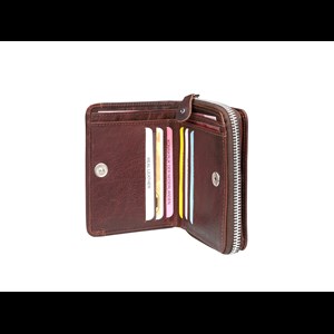 En handy, praktisk damepung af oksehud. I midten er der et lynlåsfag til mønter og på ydersiden to udfoldelige klapper, der lukkes med tryklåse. Pungen har fjorten fag til kort, to til sedler og to ekstra fag.