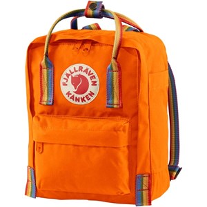 Special Edition Kånken Mini-rygsæk med regnbuestropper. Slidstærkt Vinylon med en lynlås, som åbner hele hovedrummet. Rygsækken er forsynet med et udtageligt siddeunderlag, en lille lomme foran, enkle skulderremme og hanke foroven.