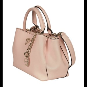 Lille smart håndtaske med Guess logo på fronten. To hanke samt lang justbar skulderrem.Tasken har tre rum det ene lukkes med lynlås samt lynlåslomme på bagsiden.Aftagelig charms som også kan bruges som nøglering.fin taske som både kan bruges til hverdag og fest.