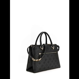 Guess håndtaske i præget logo materiale. Tasken har 2 håndremme med kæder samt et flot Guess vedhæng. Indvendigt har er tasken opdelt i 3 rum hvor det midsterne lukkes med lynlås og de 2 siderum lukkes med trykknap. Der findes også små lommer med og uden lynlås i midter rummet.