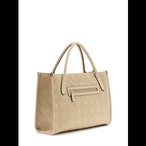 En struktureret håndtaske med et elegant, gennemgående monogrammønster. Tasken har to faste hanke og en praktisk lynlåslomme på ydersiden. Den faste form giver et sofistikeret og professionelt udtryk, og designet gør den velegnet til både hverdag og arbejde.