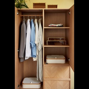 Opbevaringskasser i sæt af 2 stk. i et eneklt og minimalistisk stil. Materiale Bambus, Bomuld 30%, Kanvas, Polyester 50%