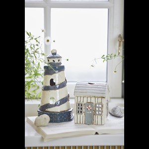 Sødt fyrtårn lavet i keramik til fyrfadslys fra Ib Laursen. De små populære keramikhuse rammer tidens tendenser med at indrette med kunsthåndværk i hjemmet. Lyshus som vil sprede masser af hygge, når fyrfadslysene tændes.
