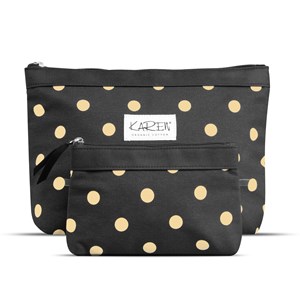 Karen 2-delt toilettaske sæt i økologisk bomuld og med fór af genanvendt plastik. Toilettasken er fremstillet i økologisk bomuld, som kan maskinvaskes. Sættet består af en makeup pung/organiser som kan bruges til f.eks øresnegle og ladere når du er på farten og den rummelige toilettaske kan passe på alle dine produkter. Begge i sort med creme bomber. Den rummelige taske indeholder fire indvendige lommer og foret er quiltet, hvilket giver tasken en ekstra beskyttelse mod hårdhændet behandling. Bliver toilettasken beskidt kan den vaskes i vaskemaskinen ved 30 grader. Tasken er udstoppet i Danmark for at spare på co2 under fragten, en stor synder i vores fælles co2 regnskab.