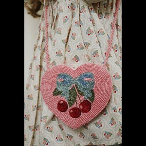 Sød lille hjerteformet skuldertaske prydet med perler, der er påsat i hånden. Hver taske er håndlavet og unik. Vær opmærksom på små dele og lange snore. Velegnet fra 3 år.