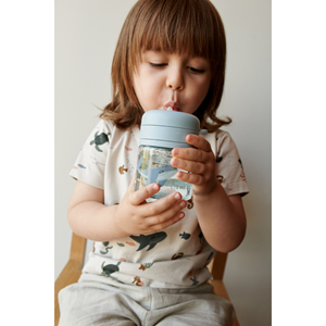 Fin drikkeflaske med låg og sugerør. Den kan indeholde 280ml.