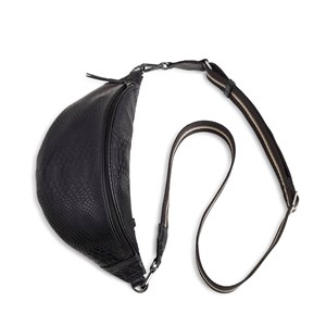 Elinor Bum Bag med slangelook fra Markberg. Smart bum bag som har en lynlåslomme indvendig. Lukkes med lynlås og har en lynlåslomme på bagsiden. Taskens Finley Guitar strop er aftagelig og justerbar. Bestem din taskes udseende ved at udskifte remmen, hvilket er super smart til at give tasken et twist. 100 % bomuldsfor.