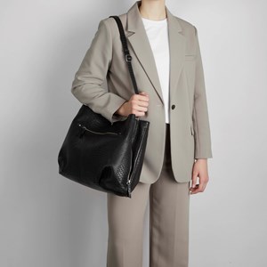 Dana Skuldertaske Large fra Markberg er en cool stor og rummelig taske, der er produceret i koskind, med et snake udtryk. Tasken kan bruges som både en skulder- og crossbody taske. Tasken har fine lynlåsdetaljer på fronten og på siderne. Tasken har både en aftagelig hank- og crossbody strop i læder. Tasken har et stort rum indvendigt, med en lille lynlåslomme. Crossbody-stroppen kan justeres i længden. Taskens foer er i 100% bomuld.