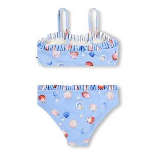 Strækbar bikini til aktive børn, designet til at sikre fri bevægelighed og komfort. Den smarte overdel har en flot flæsedetalje og smalle stropper, mens underdelen byder på en elastisk talje med flæsekant for en behagelig pasform. Begge dele er helforet for ekstra kvalitet og støtte, perfekt til sjove dage ved vandet. Denne bikini kombinerer stil med praktiske detaljer, så dit barn kan lege frit.