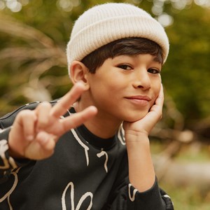 Ribstrikket hue i uld fra Molo med ombuk og Molos logo.