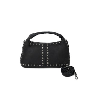 Dandy i kalveskind med sølvnitter som dekoration foran. Tasken har et hovedrum, der lukkes med lynlås. Brug den crossbody med den justerbare rem. Den lange rem kan tages af.