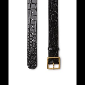 Læderbælte Lindi fra Saddler. Krokodillemønstret damebælte i vegetabilsk garvet læder, fremstillet i Italien. Et lidt bredere bælte med et spænde i guldfarvet metal med en mat finish. Læderet i dette produkt er af højeste kvalitet og er blevet behandlet i et garveri certificeret af Leather Working Group.
