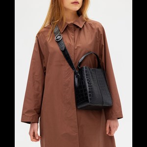 Tote model Elsa mini fra SADDLER i bøffellæder. Justerbar og aftagelig skulderrem. To åbne rum med magnetlukning. Lynlåslomme i midten fungerer også som rumopdeler. Tasken er uforet men lommen i midten er i 100% polyester.