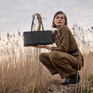 Totebag Luna fra Saddler. Fremstillet i full grain koskind, certificeret af Leather Working Group. En todelt lomme samt en lynlåslomme indvendigt. Lukning med lynlås på toppen af tasken med to lynlåsskydere. Indersiden er foret med 100 % polyester. Skulderrem med en længde på 58 cm. Hardware i blankt sølvfarvet metal. Præget Saddler-logo.