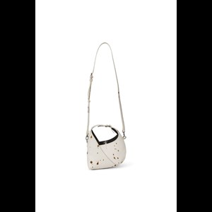 Lille taske i kohår og læder med buet skulderrem. Bar-lukning på indersiden. Metalbeslag i form af det ikoniske ø på skulderremmen. Lomme med logo på indersiden. Sølvfarvede metalbeslag. Hovedmateriale i koskind.