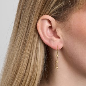 Element ørehængerne samler tre fine detaljer på en elegant kæde, der skaber let og levende bevægelse omkring ansigtet. Inspireret af solens sidste skær fanger den polerede overflade lyset diskret og giver et udtryk, der er roligt, cool og fuld af kant. Øreringene måler 35 mm og er skabt til daglig brug. Bær dem alene for et enkelt look, eller mix med små ørestikker og andre øreringe for et personligt ear stack.