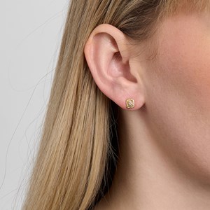 Solara øreringene er håndlavede med en blød, afrundet firkantet form og en fin struktureret overflade, der fremhæver den runde zirkonia i midten. Den diskrete indgraverede sunburst-detalje samler lyset og giver et roligt, selvsikkert udtryk tæt på øreflippen, hvor øreringen føles behagelig hele dagen. Øreringene måler 7 mm og kan bæres alene for et clean hverdagslook, eller kombineres i en ear stack med små hoops og andre øreringe til et afdæmpet aftenlook.