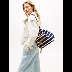 Denne skuldertaske har et moderne og sommerligt udtryk med sit elegante stribede design. Kombinationen af tekstil og fine detaljer giver tasken et afslappet, men eksklusivt look. Den dekorative snørelukning og den feminine kæderem tilfører karakter og gør tasken nem at style til både hverdag og ferier. Tasken har god plads til dine vigtigste ejendele og er et stilfuldt valg, når du ønsker et let og sofistikeret accessory.
