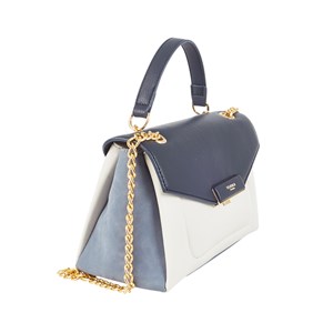 Fin flerfarvet taske med en forlomme og indvendig flere rum, hvoraf et lille er med lynlås. Tasken kan enten bæres i hanken eller i skulderkæden. Der er også en baglomme med lynlås.