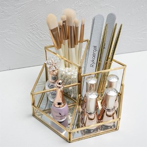 Organiser dine skønhedsprodukter med stil med UNIQ Geometrisk Makeup Organizer. Denne elegante opbevaringsløsning er designet til at løfte dit skønhedsområde, samtidig med at den holder din makeup, pensler og hudplejeprodukter pænt og ordentligt. Perfekt til enhver make-up station eller badeværelsesbord, da dens moderne geometriske design kombinerer funktionalitet med luksus. Organizerens holdbare glas og sofistikerede guldfarvede metalramme giver både stil og funktion. Den har flere rum, der gør det muligt at opbevare makeup, pensler og andre accessories. Uanset om det er foundation, læbestifter eller din yndlingsparfume, har alt sin egen plads. Den transparente design gør det nemt at finde dine produkter, samtidig med at den holder dit område ryddeligt. Med flere separate rum, herunder mindre områder til ting som læbepomader og neglelak og større pladser til flasker eller pensler, opfylder denne organizer alle dine opbevaringsbehov til skønhedsprodukter. Dens kompakte og funktionelle design passer perfekt på enhver bordplade eller make-up station og tilfører et elegant touch til dit rum.