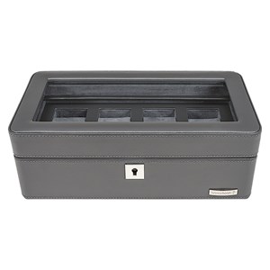 Urboks til overskuelig opbevaring af ure. Fint håndværk, høj kvalitet og meget holdbar. Der er plads til 4 ure, og puderne har tilstrækkelig afstand – også til større modeller. Låget er udstyret med et vindue, og urpuderne er individuelt aftagelige og godt polstrede for sikker opbevaring. Urpuderne har en bredde på 40 mm.